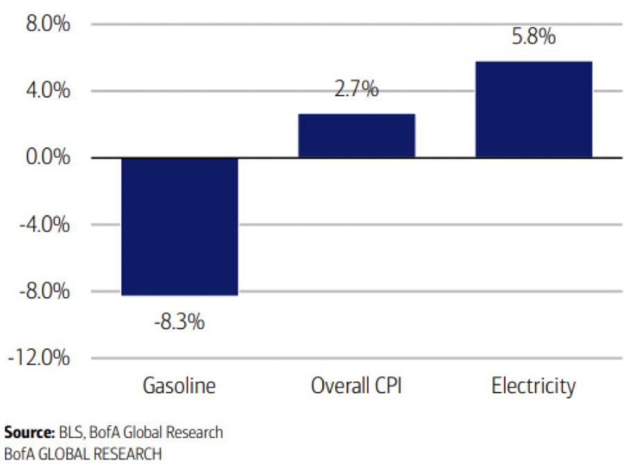 The chart above shows the year-over-year June 2025 Consumer Price Index inflation data. U.S. electricity prices have been rising, with the year-over-year inflation rate reaching 5.8%, up from 3.8% in January, according to Bank of America Institute. Increased electricity demand from artificial intelligence, industrial onshoring, and consumer adoption of electric vehicles and heat pumps are boosting costs. Analysts note that the growth of data centers and AI computing could require an additional 18–28 gigawatt of generation capacity by 2026, putting further upward pressure on prices. Overall, rising industrial and technological demand is driving sustained electricity cost growth.