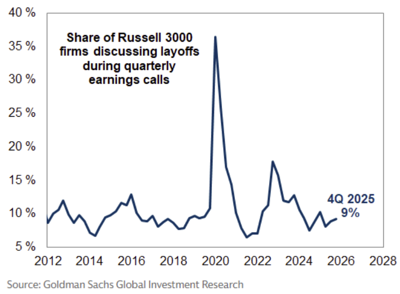 Labor market data is sending mixed signals. Corporate discussions of layoffs on earnings calls remain limited, consistent with stable weekly jobless claims and a solid January payroll report. However, job openings fell to 6.5 million in December—the lowest level since September 2020 and well below expectations—signaling softer labor demand. In addition, substantial revisions reduced last year’s job growth to 181,000, the weakest since 2020 and significantly below the previously reported 584,000. Overall, the labor market appears to be in transition—openings are shrinking, but employers are still filling roles, creating a low-hire, low-fire environment.