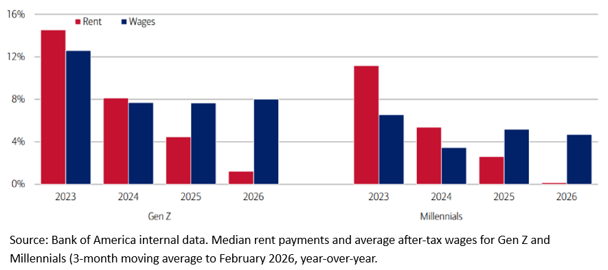 There’s some encouraging news for younger renters. Bank of America data suggests median rent growth for Gen Z and Millennials has slowed sharply over the past two years, after the surge in 2023 and 2024. Even better, after-tax wage growth for these groups is now running ahead of rent increases, which is a welcome shift since housing usually takes the biggest bite out of household budgets. This extra breathing room is important, especially as gas prices rise. Younger consumers tend to spend a larger share of discretionary income on fuel, so if pump prices stay elevated, they could start to squeeze spending on non-essentials such as travel and electronics.