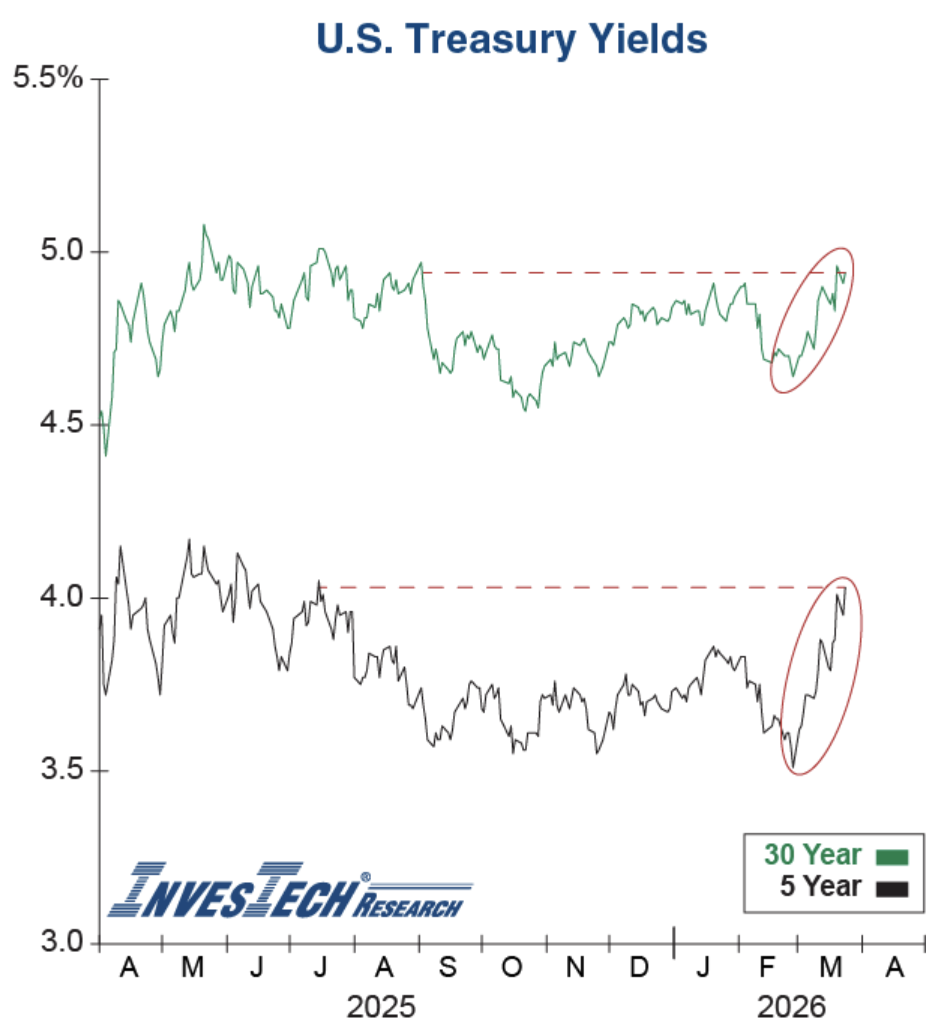 The S&P 500 has declined for five consecutive weeks amid multiple headwinds, including the conflict with Iran, private credit pressures, and ongoing uncertainties around artificial intelligence. While media coverage has focused largely on the war, all three risks are impacting the market and require monitoring. Equities are trading inversely to oil, and prices above $100 per barrel have weighed on the market. Private credit has come under pressure due to rising interest rates and concerns over loans made specifically to software companies, a popular sector for many private credit funds. Markets are grappling with the risk that these companies could be disrupted by AI, potentially reducing their ability to repay those loans. While concerning, these issues remain largely sector-specific rather than systemic. AI-related worries also persist, including doubts over returns on massive investments. We expect private credit and AI concerns could linger, but the Iran conflict, at least, has the potential to resolve in the near term and trigger a rebound. For markets to stabilize, investors need tangible signs of de-escalation, such as direct U.S.-Iran talks or credible restraint signals, rather than social media updates. Meanwhile, economic data will be closely watched for signs of stagflation, as rising prices and slowing growth may drive additional volatility. Our positioning in less-volatile, AI -resilient, and high-cash-flow-sectors is designed to help manage downside risk while keeping portfolios positioned for potential rebounds.